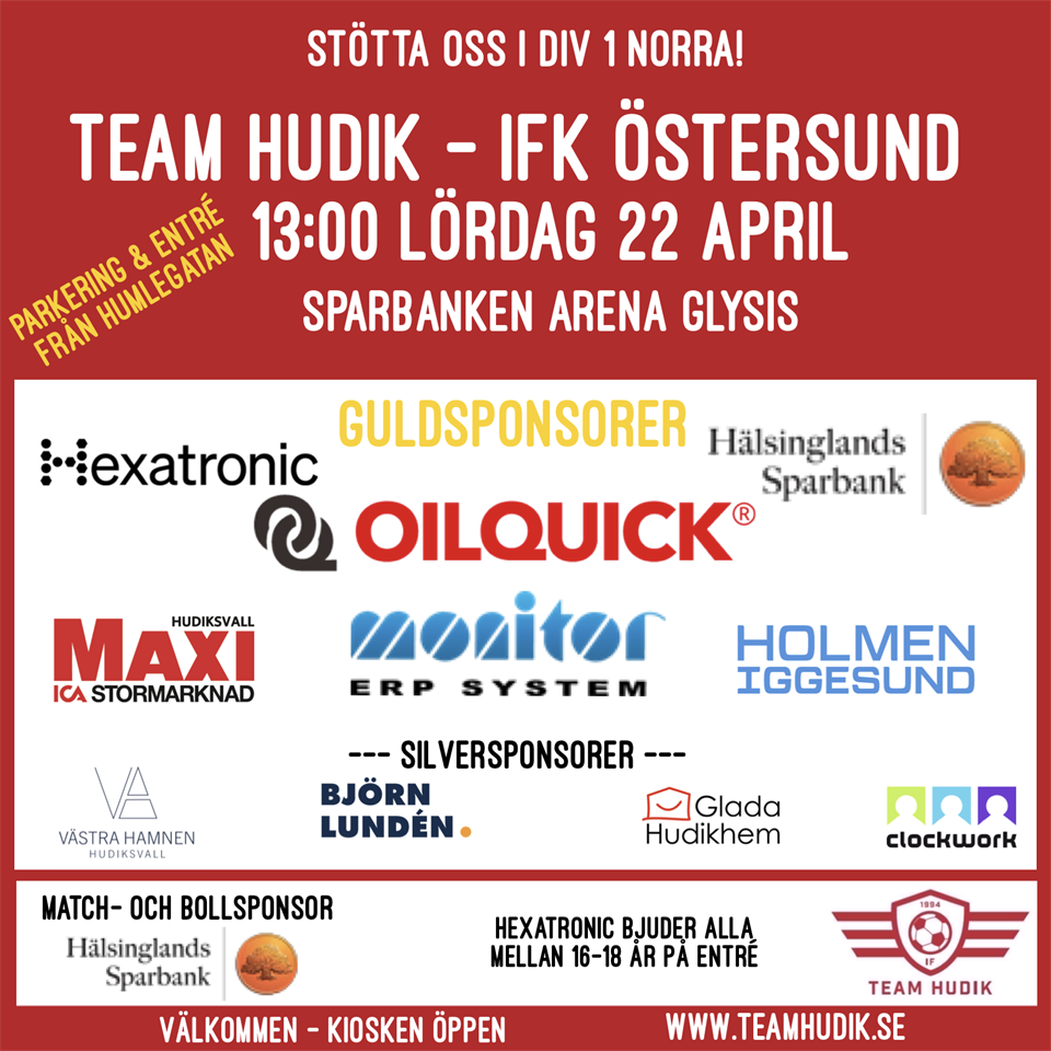 Välkommen till Sparbanken Arena imorgon Kl. 13:00, då vårt damlag möter IFK Östersund i div 1 Norra. Match och bollsponsor är Hälsinglands Sparbank och Hexatronic bjuder alla upp till 18 år på fri entré. Kiosken är öppen, där säljs mycket gott samt Årskort. Varmt välkomna!! Observera att parkeringen är bakom läktaren, infart från Humlegatan. IF Team Hudik 21 apr 2023 0kommentarer