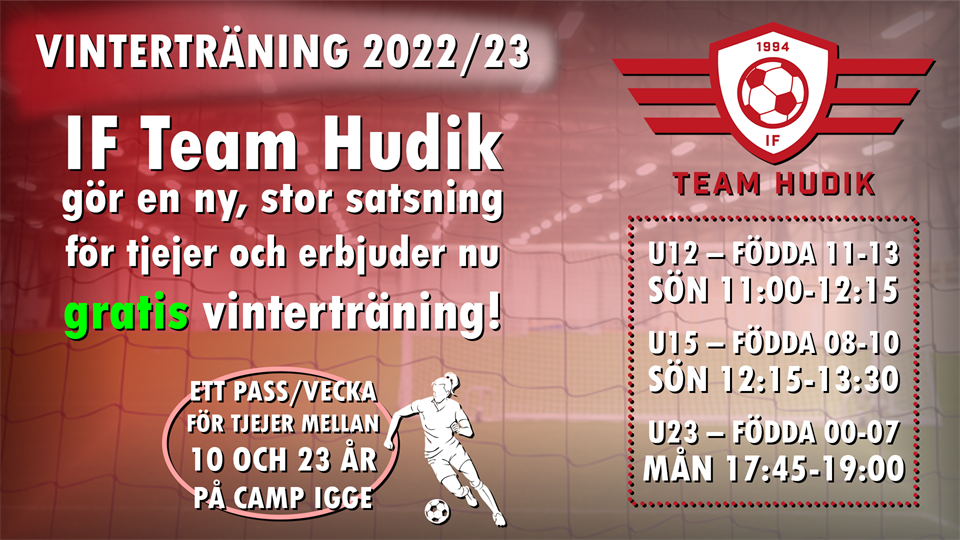 IF Team Hudik kör under vecka 46 igång med VINTERTRÄNING på Camp Igge för alla fotbollsintresserade tjejer. Träningen är för Dig mellan 10-23 år, oavsett klubbtillhörighet. Träningarna är gratis och bedrivs av vår fotbollsutvecklare Tobias Kelly. Är Du intresserad, anmäl dig genom att markera länken nedan, öppna formuläret och fyll sedan i dina uppgifter. https://docs.google.com/forms/d/1NZqURUivpBhOSkBHENaGnRRotjEaYi2E6CavB31Ed2c/edit Vi ses! Div 1 Dam / TH 1 26 okt 2022 0kommentarer