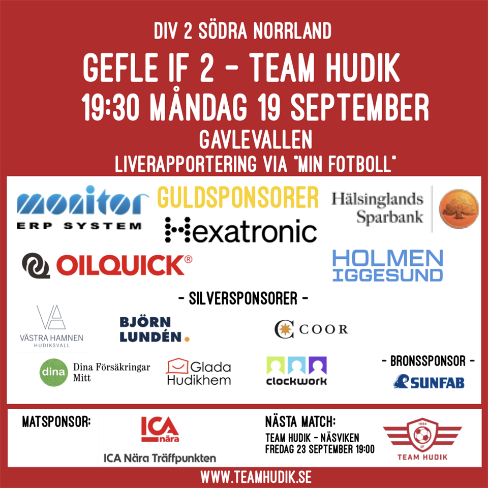 Team Hudik åker till Gävle för match måndag 19 september kl 19:30 på Gavlevallen. Hoppas att ni följer och stöttar oss på plats, via kommentarer i appen Gefle IF2 - IF Team Hudik Ladda gärna ner appen Min Fotboll Dagens matsponsor är ICA Nära Träffpunkten, Hudiksvall Passa på att se Team Hudik2 - Kilafors på Glysis Sparbanken Arena. Spelas lördag 17/9 med avspark 12:00! Div 1 Dam / TH 1 16 sep 2022 0kommentarer