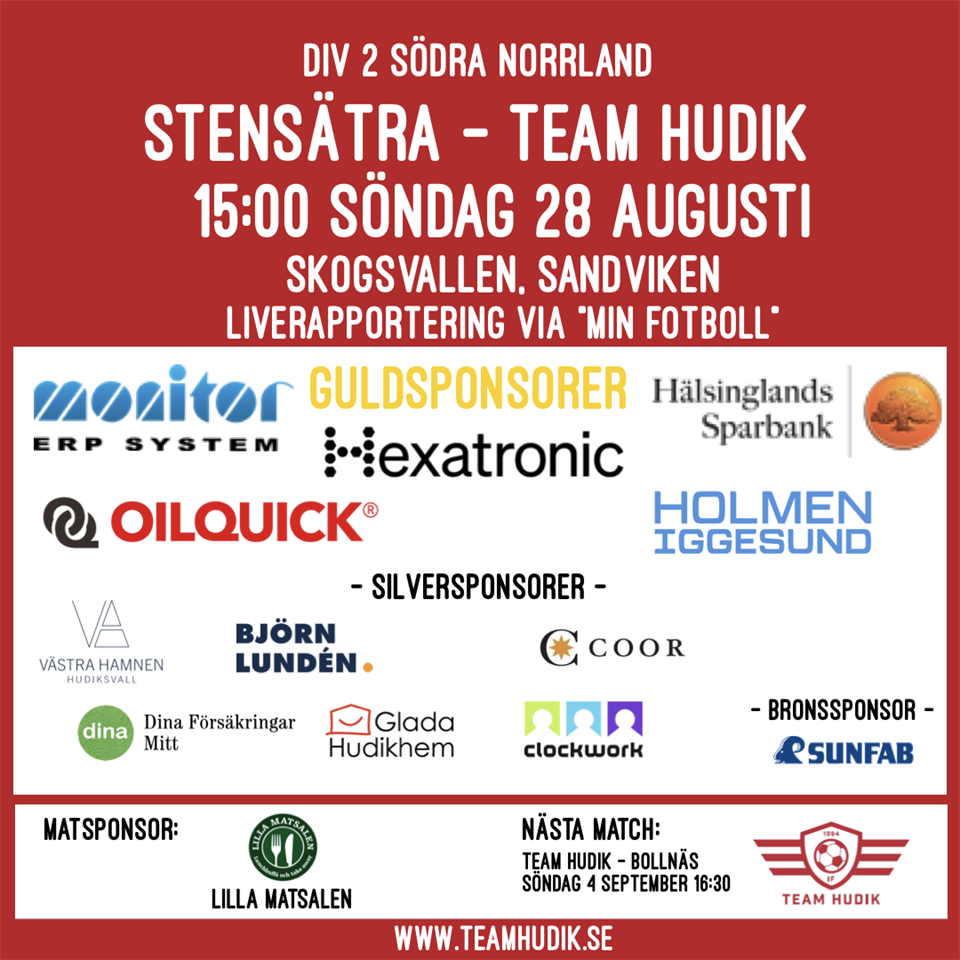 Team Hudik åker till Stensätra för match söndag 28 augusti kl 15:00 på Skogsvallen, Sandviken. Hoppas att ni följer och stöttar oss på plats, ellervia kommentarer i appen Stensätra IF - IF Team Hudik Ladda gärna ner appen Min Fotboll Dagens matsponsor är Lilla Matsalen, Hudiksvall Div 1 Dam / TH 1 27 aug 2022 0kommentarer