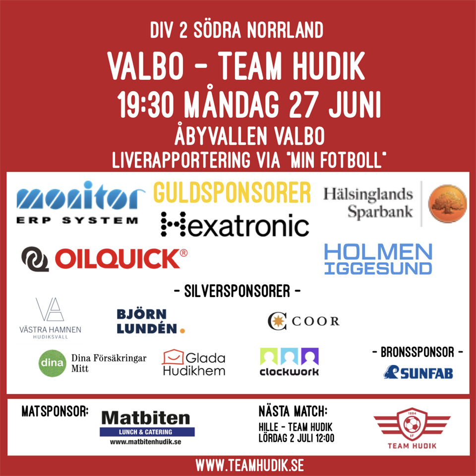 Team Hudik åker till Valbo för match måndag 27 juni som startar kl 19:30 på Åbyvallen i Valbo. Hoppas att ni följer och stöttar oss på plats, via kommentarer i appen Valbo FF - IF Team Hudik Ladda gärna ner appen Min Fotboll Dagens matsponsor är Matbiten Div 1 Dam / TH 1 26 jun 2022 0kommentarer