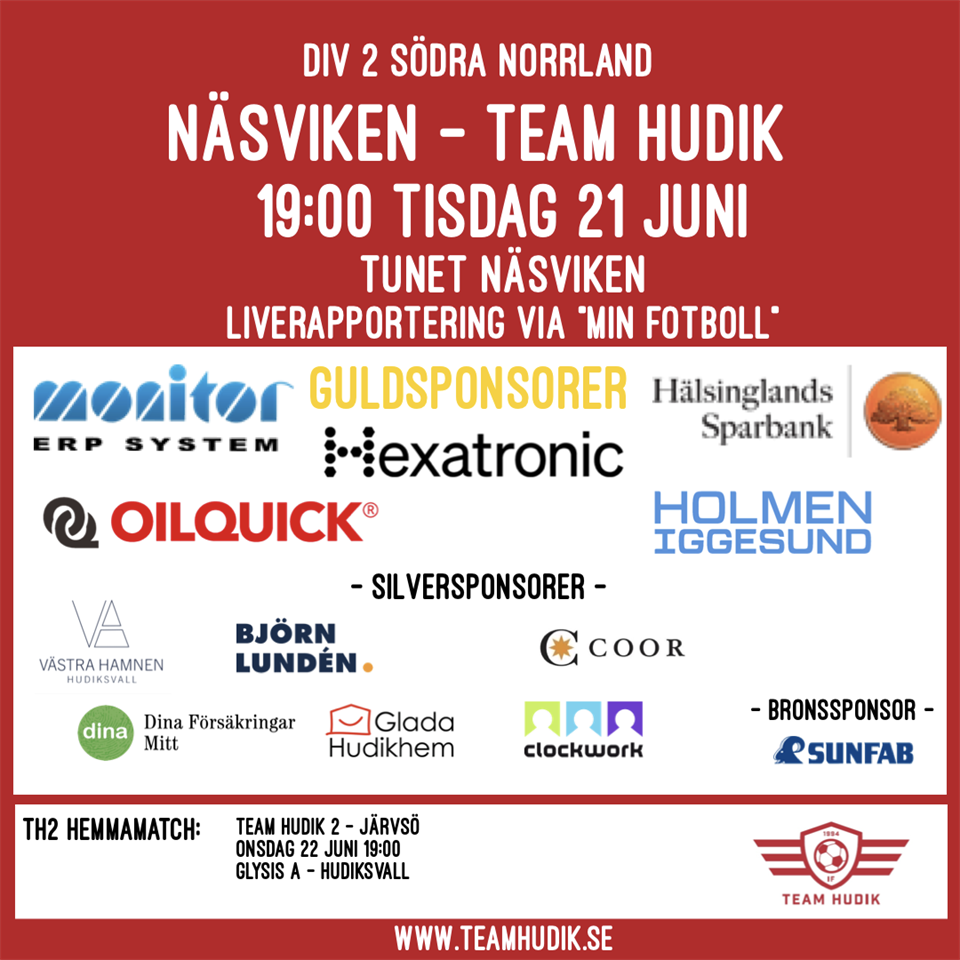 Team Hudik åker till Näsviken för match tisdag 21 juni som startar kl 19:00 på Tunet i Näsviken. Hoppas att ni följer och stöttar oss på plats, via kommentarer i appen Ljusdals IF - IF Team Hudik eller på Hudiksvalls Tidning Livesport (kräver abonnemang). Besök gärna Glysis A-plan på onsdag 22 juni kl 19:00 då Järvsö möter vårt TH2! Ladda gärna ner appen Min Fotboll Div 1 Dam / TH 1 21 jun 2022 0kommentarer