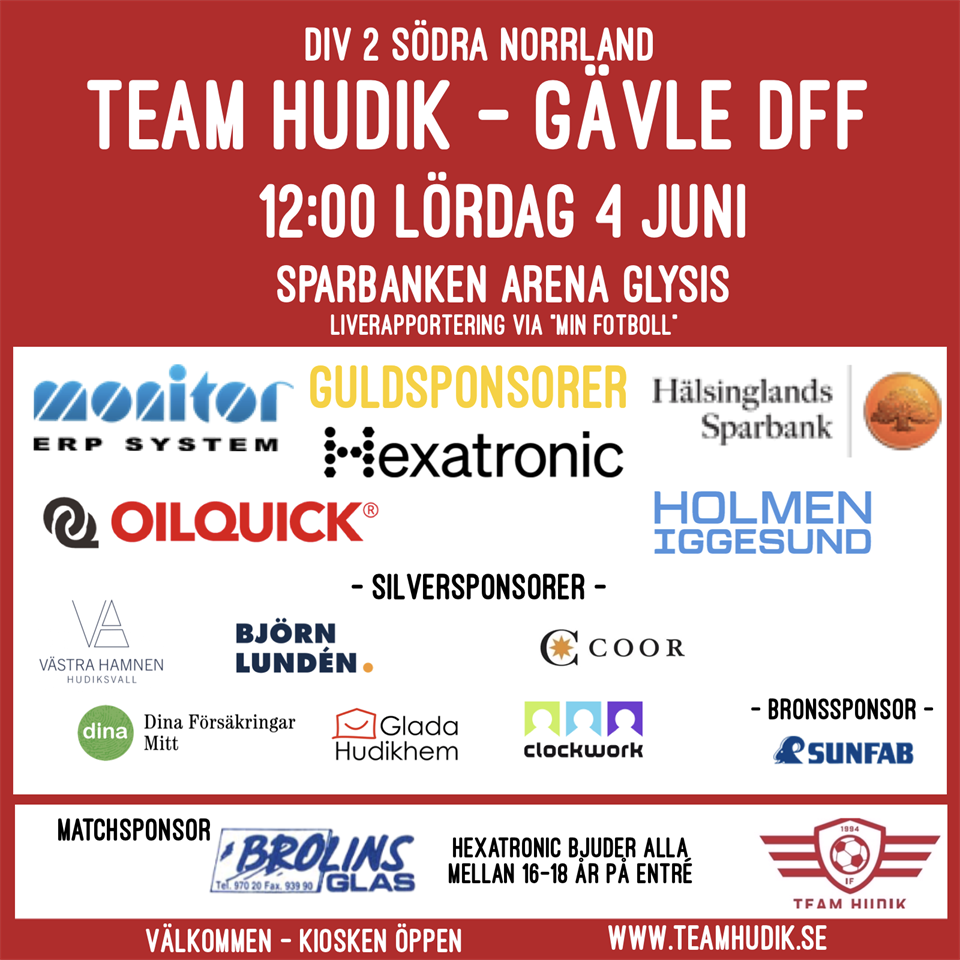 Välkommen till match i Div 2 Södra Norrland mellan Team Hudik och Gävle DFF. Matchen startar kl 12:00 lördag 4 juni och spelas på Glysis Sparbanken Arena. Hoppas att ni följer och stöttar oss på plats! Mål kommer att rapporteras i Min FotbollIF Team Hudik - Gävle DFF Ladda gärna ner appen Min Fotboll Dagens matchsponsor är Brolins Glas Div 1 Dam / TH 1 2 jun 2022 0kommentarer