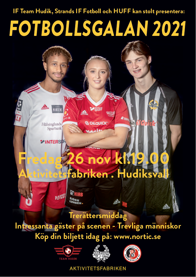 Nu tar vi tidigare HuFF-galan ett steg längre. IF Team Hudik, Strands IF och HuFF tror på samarbete och bjuder därför in till en gemensam Fotbollsgala 26 november på Aktivitetsfabriken. Kvällen bjuder på 3 rätters middag, underhållning, auktion och gäster. Galans konferencier är Pär Johansson och allt överskott delas lika mellan föreningarna. Köp din biljett via länk. https://www.nortic.se/tickets/event/34435 Varmt välkommen önskar IF Team Hudik, Strands IF & Hudiksvalls FF Div 1 Dam / TH 1 2 nov 2021 0kommentarer
