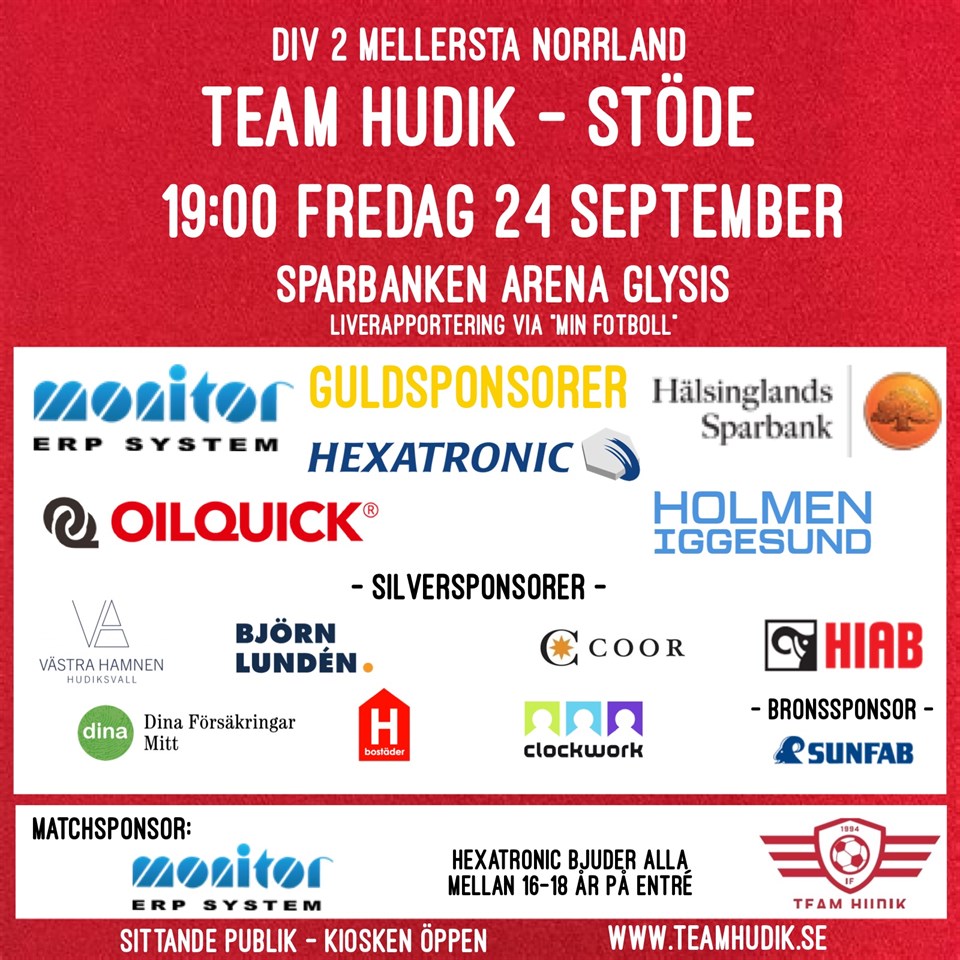 På fredag 24/9 kommer Stöde IF till Hudiksvall för match i div 2 Mellersta Norrland. Matchen spelas på Sparbanken Arena Glysis och startar 19:00 Kom och se och heja fram Team Hudik! Matchsponsor: Monitor ERP System Div 1 Dam / TH 1 23 sep 2021 0kommentarer