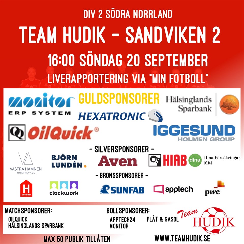 Välkommen till Sparbanken Arena på söndag. Kl 16 spelas sista hemmamatchen för säsongen och det är Sandvikens IF 2 som står för motståndet. Vi tar emot max 50 personer i publiken och du kan även se matchen via appen " Min Fotboll". IF Team Hudik 16 sep 2020 0kommentarer