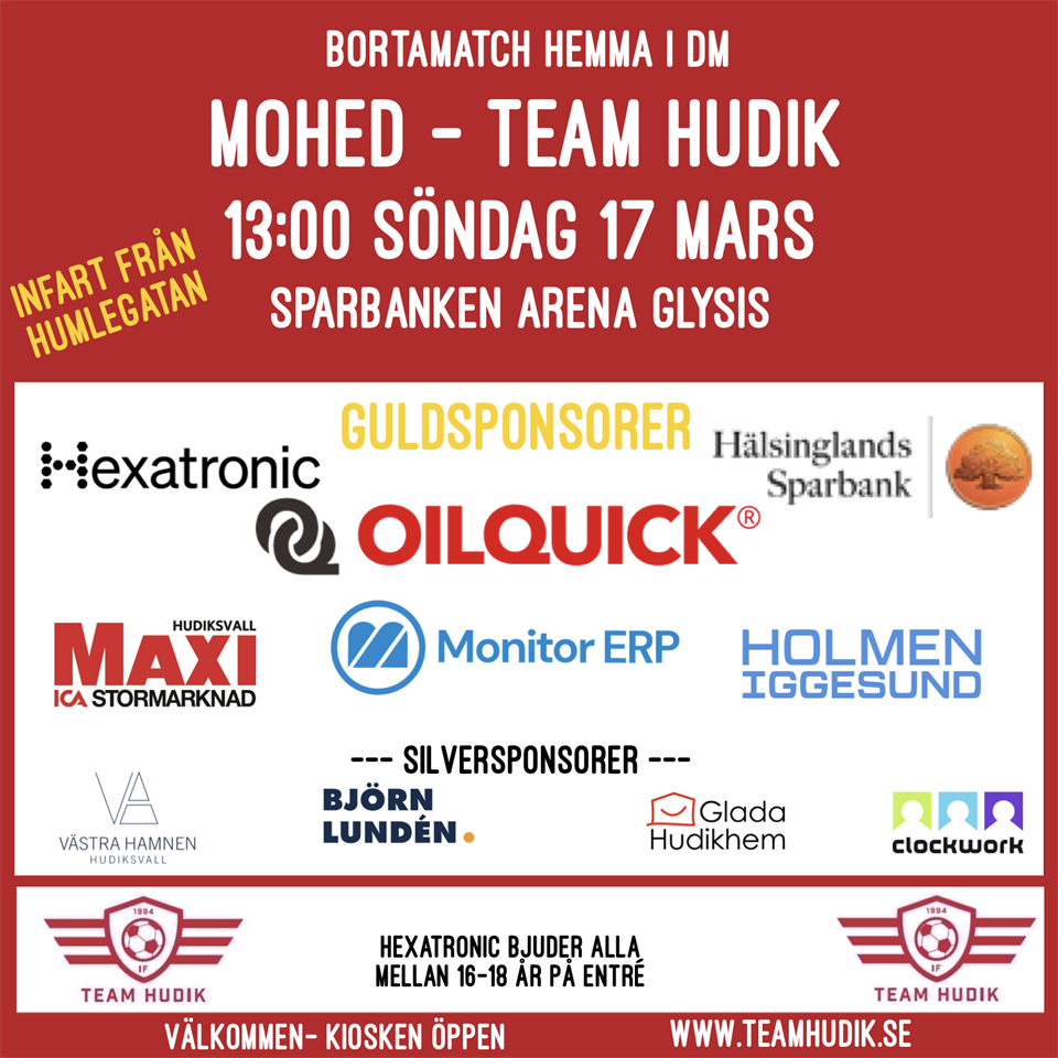 Team Hudik spelar match i DM-gruppspelets andra omgång. Den spelas mot Mohed på Sparbanken Arena Glysis 17 mars och startar kl 13:00 Pga andra matcher, hockey och snöupplag vädjar Glysisvallen AB att ni helst lämnar bilen hemma eller samåker. Hoppas att ni följer och stöttar oss på plats eller via kommentarer i appen Moheds SK - IF Team Hudik Ladda gärna ner appen Min Fotboll Div 1 Dam / TH 1 16 mar 2024 0kommentarer