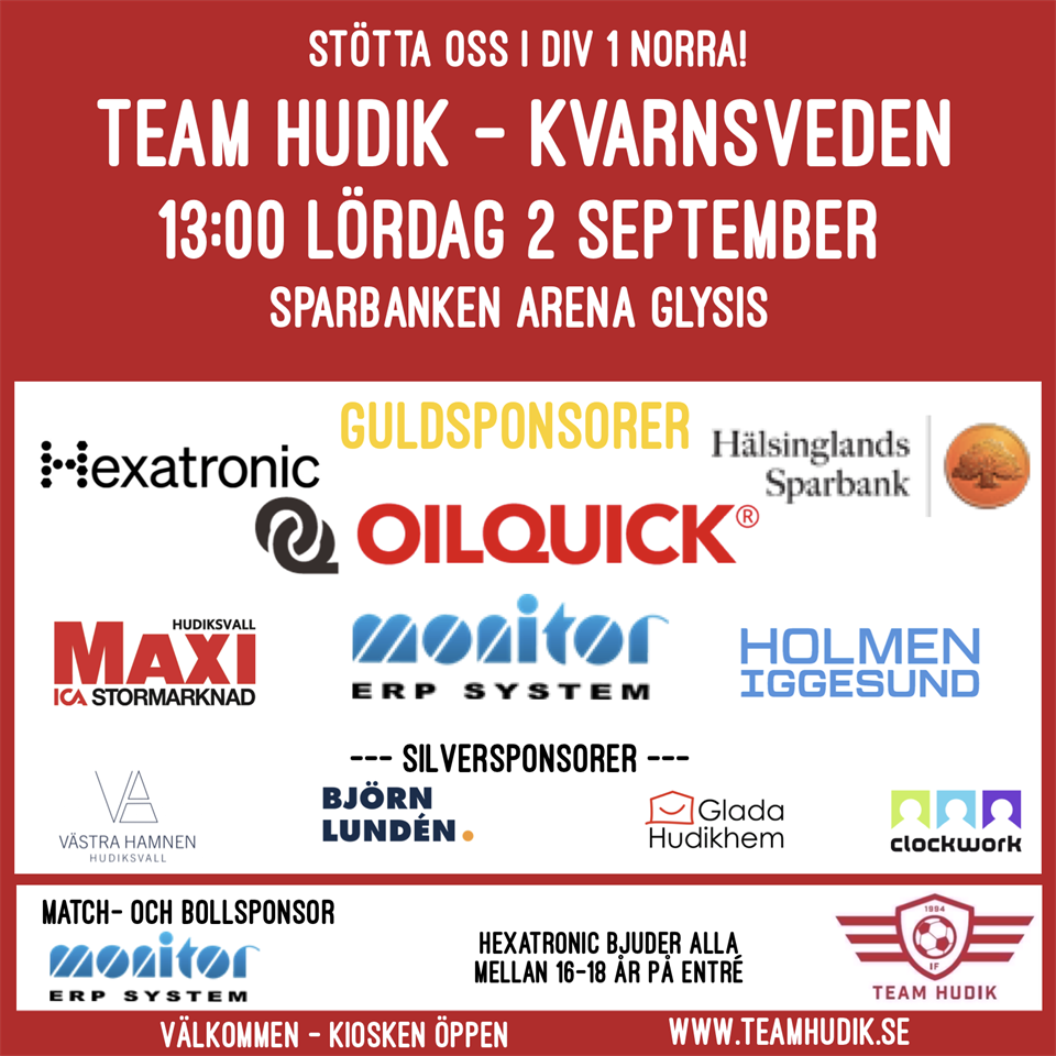 Välkommen till Sparbanken Arena kl 13:00, nu på lördag 2/9, då vi tar emot gästande Kvarnsvedens IK i div 1 Norra. Ditt stöd är viktigt, så kom och se matchen, ta en fika och stötta oss! Matchsponsor är Monitor ERP System som kommer utse matchens lirare i båda lagen. Hexatronic bjuder alla upp till 18 år på fri entré. Hoppas att ni följer och stöttar oss på plats eller via kommentarer i appen IF Team Hudik - Kvarnsvedens IK Ladda gärna ner appen Min Fotboll Om du inte kan se matchen på plats, så sänds också av Hudiksvalls Tidning med start 18:50 länk För att se livesportsändningar krävs en prenumeration på +Allt, Digital Premium, Total eller Helg Div 1 Dam / TH 1 31 aug 2023 0kommentarer