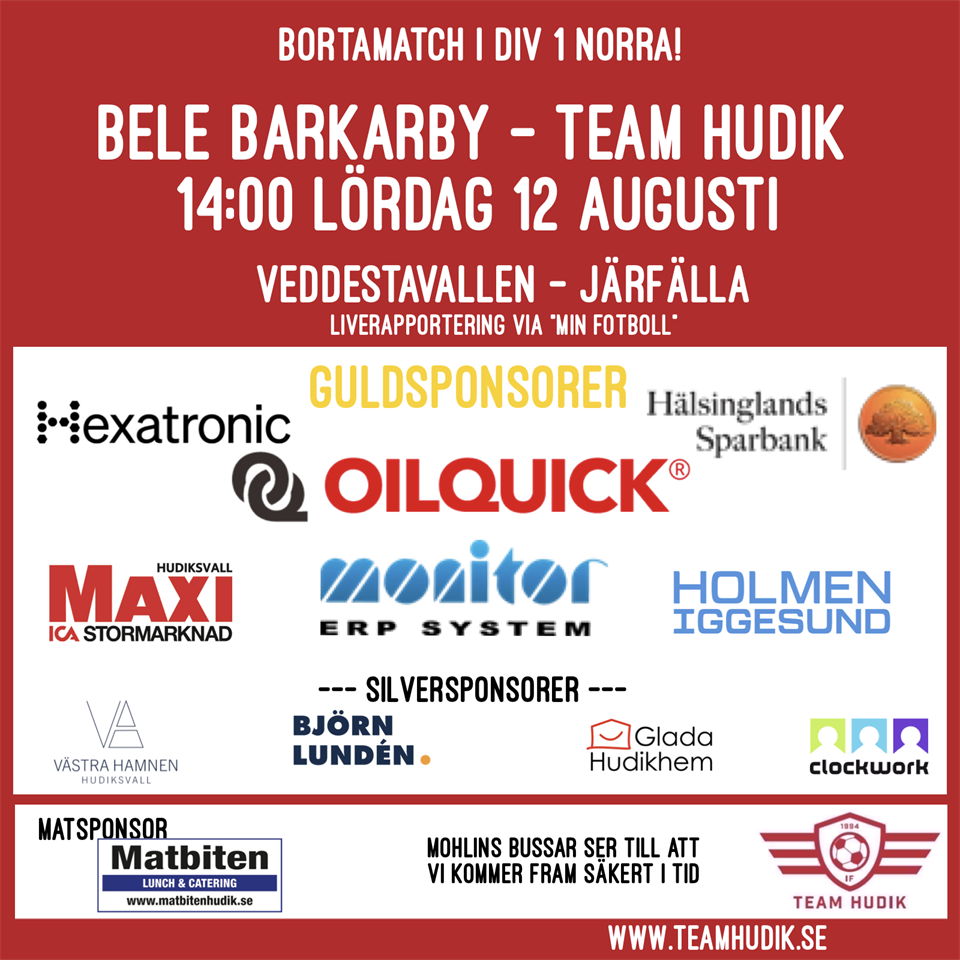 Bussen rullar söderut när Team Hudik åker till Järfälla för match lördag den 12 augusti. Matchstart kl. 14:00 Hoppas att ni följer och stöttar oss på plats eller via kommentarer i appen Bele Barkarby IF - IF Team Hudik Ladda gärna ner appen Min Fotboll Dagens matsponsor är Matbiten i Hudiksvall Div 1 Dam / TH 1 12 aug 2023 0kommentarer