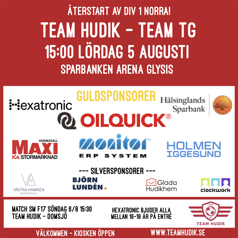 Team Hudik möter Team TG från Umeå för första matchen efter sommaruppehållet i Division 1 Norra. Den spelas på Sparbanken Arena Glysis lördag den 5 augusti och matchstart är kl 15:00 Hoppas att ni följer och stöttar oss på plats eller via kommentarer i appen IF Team Hudik - Team TG Ladda gärna ner appen Min Fotboll Välkommen! Det verkar inte som Hudiksvalls Tidning sänder matchen länk Vi sänder via Spiideo Play utan kommentator länk Div 1 Dam / TH 1 4 aug 2023 0kommentarer